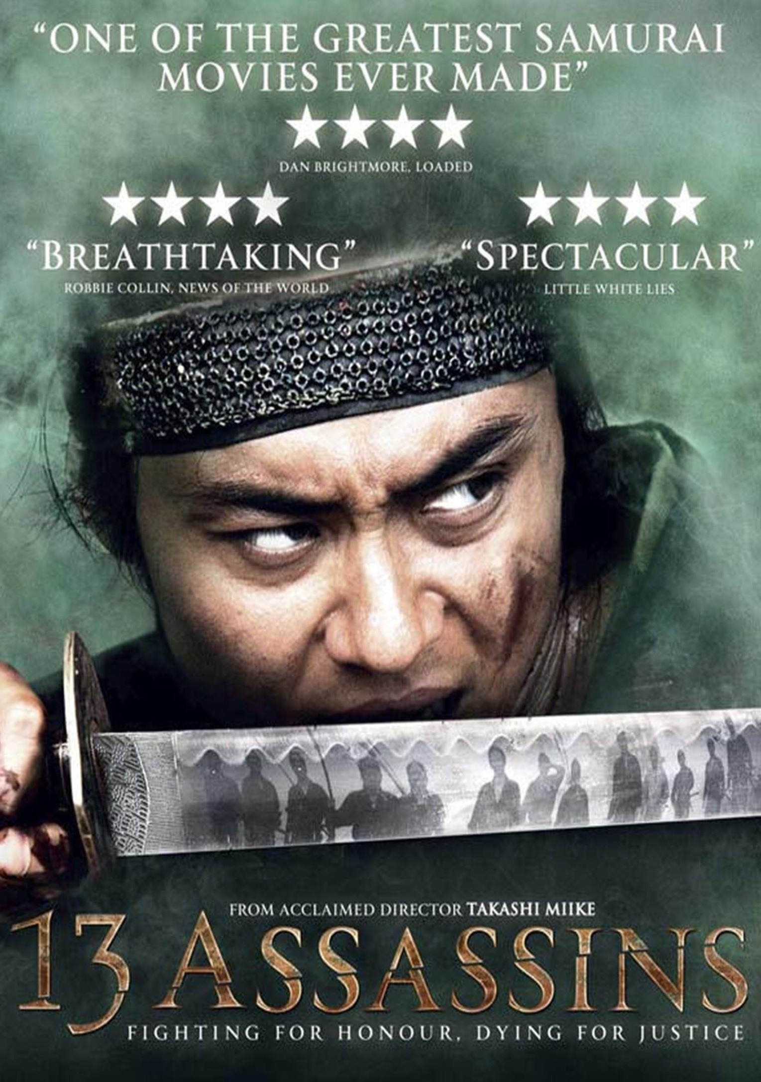 Plot: In 1844, the peace of Feudal Japan is threatened by cruel Lord Naritsugu Matsudaira, who is politically rising and getting closer to his half-brother, the shogun. After the harakiri of the Namiya clan leader, samurai Shinzaemon Shimada is summoned by the shogun's advisor Sir Doi of the Akashi Clan to listen to the tragedy of Makino Uneme, whose son and daughter-in-law have been murdered by Naritsugu. Then Sir Doi shows a woman with arms, legs and tongue severed by Naritsugu and she writes with her forearm a request to Shinza to slaughter Naritsugu and his samurai. Shinza promises to kill Naritsugu and he gathers eleven other samurais and plots a plan to attack Naritsugu in his trip back to the Akashi land. But the cunning samurai Hanbei Kitou that is responsible for the security of his master foresees Shinza's intent. Shinza decides to go with his samurai through the mountain, where they find the hunter Koyata that guides them off the mountain and joins the group. Now the thirteen men prepare an ambush to Naritsugu and his army of two hundred samurai in a suicide mission to stop evil.