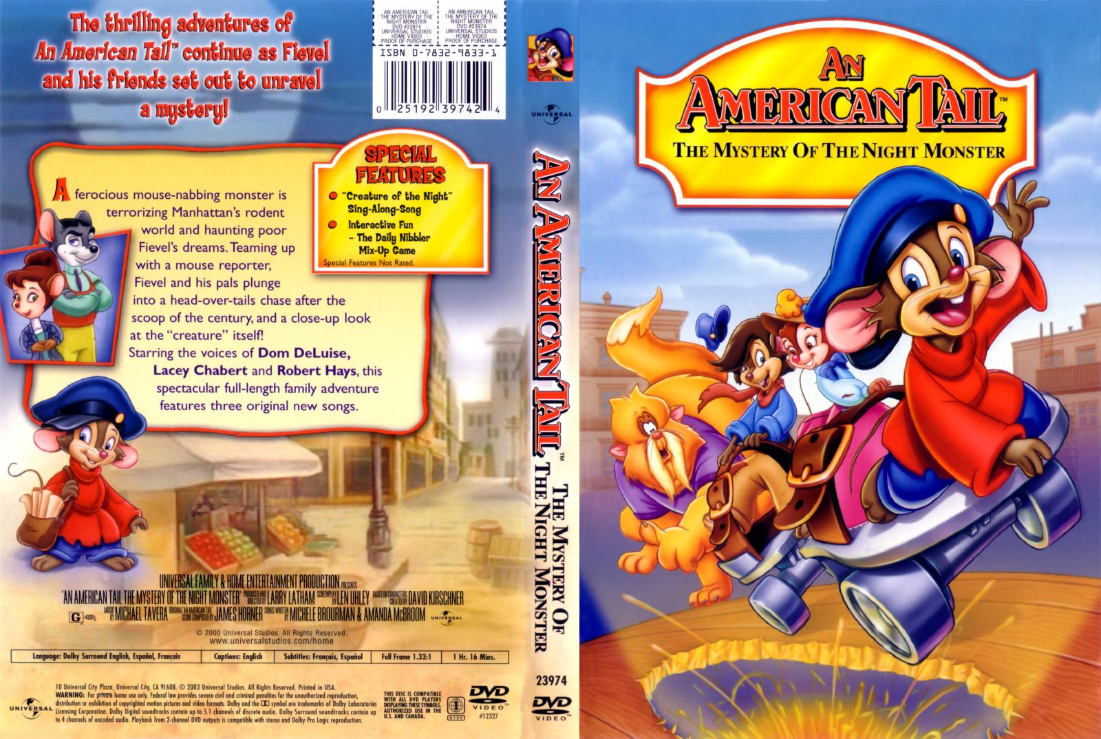 Plot: Follow the clues to fun and excitement as the beloved little mouse takes on a big monster in this charming, full-length adventure. When a ferocious, mouse-nabbing creature puts fear into the hearts of New York City's rodents, Fievel and his friends team up with a reporter to chase after the scoop of the century and -- just maybe -- get a close-up look at the bad guy himself! Featuring three original songs and the voice talents of Dom DeLuise, Lacey Chabert and Robert Hays, An American Tail: The Mystery of the Night Monster is a mischievous, musical good time that the whole family will enjoy!