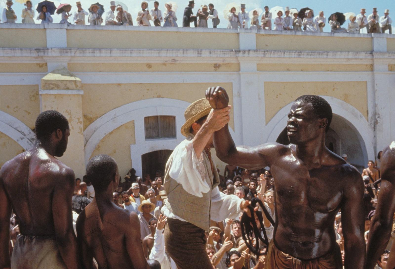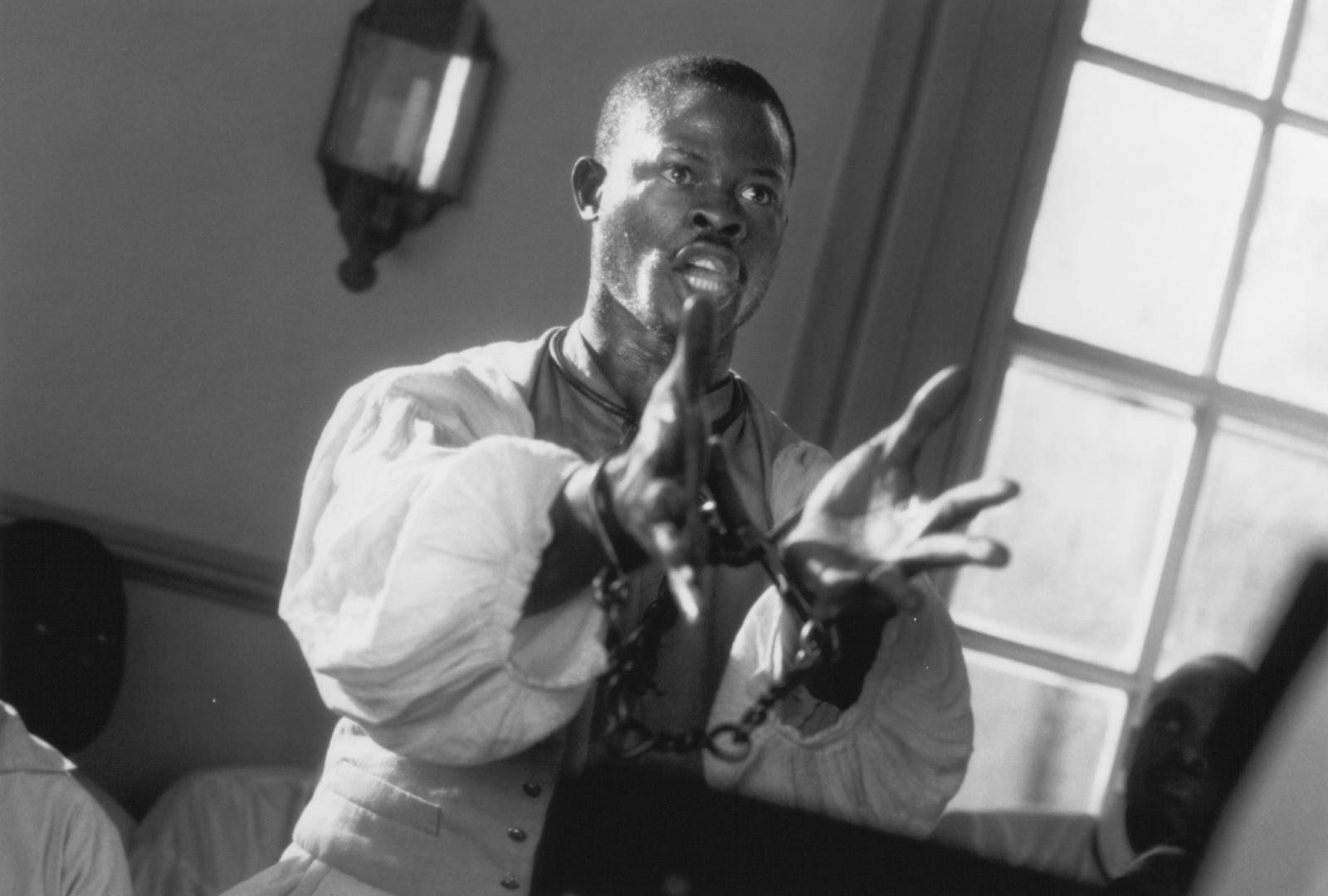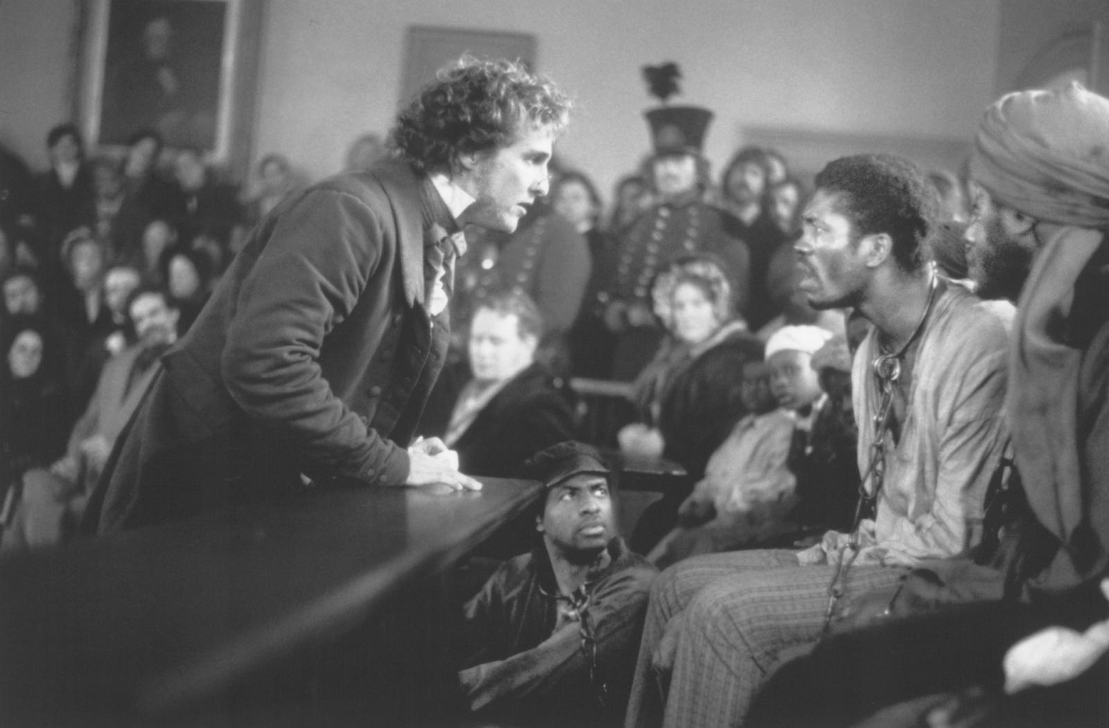 Plot: Amistad is the name of a slave ship travelling from Cuba to the U.S. in 1839. It is carrying a cargo of Africans who have been sold into slavery in Cuba, taken on board, and chained in the cargo hold of the ship. As the ship is crossing from Cuba to the U.S., Cinque (Djimon Hounsou), who was a tribal leader in Africa, leads a mutiny and takes over the ship. They continue to sail, hoping to find their way back to Africa. Instead, they are misdirected and when they reach the United States, they are imprisoned as runaway slaves. They don't speak a word of English, and it seems like they are doomed to die for killing their captors when an abolitionist lawyer decides to take their case, arguing that they were free citizens of another country and not slaves at all. The case finally gets to the Supreme Court, where John Quincy Adams (Sir Anthony Hopkins) makes an impassioned and eloquent plea for their release.
