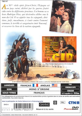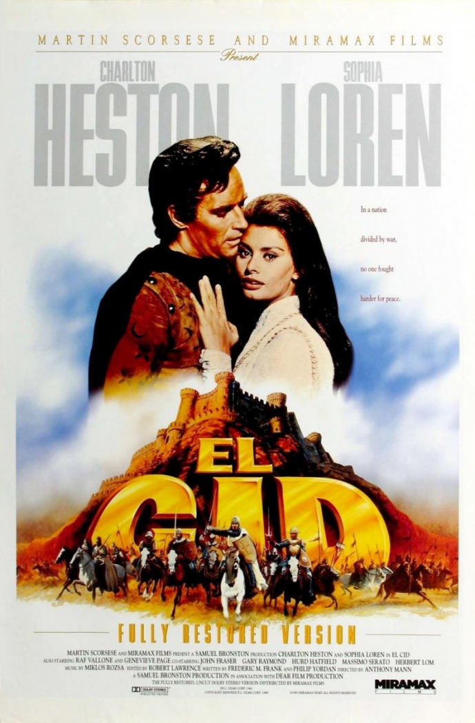 Plot: Eleventh century Spain is divided into Christian kingdoms and Moorish strongholds. The young Rodrigo Diaz de Bivar (Charlton Heston), dubbed "El Cid" by his followers, vows to see his country at peace, free from the invaders. Vigorously brave and resourceful, the noble knight hates bloodshed and faces treason charges at court for the clemency shown to some emirs. His accuser, Gormaz (Andrew Cruickshank), father of his fiancée, Jimena (Sophia Loren), dies in the resulting duel. Jimena's avowed vengeance plot fails and Rodrigo is given her hand. The marriage is not consummated and she enters a convent. On Ferdinand's (Ralph Truman's) death, his kingdom is divided amongst his three children. Sancho (Gary Raymond) challenges the decision and imprisons Alfonso (John Fraser), who is released by El Cid. The African warlord, Ben Yussuf (Herbert Lom), takes advantage of the quarrel by having Sancho assassinated. Alfonso now claims that throne, too, and exiles El Cid. Jimena realizes the nobility of her husband and joins him, but returns to the convent with their two children, when he goes into battle against Ben Yussuf. The years pass, El Cid becomes a revered warrior, but refuses to aid Alfonso, preferring his own strategy. He lays siege to Valencia, catapulting food into its starving garrison. When the Valencians kill their evil ruler, Al Kadir (Frank Thring), they offer the crown to El Cid. He sends it to Alfonso, who rushes, hysterically gratified, to his side. But El Cid has been hit by a stray arrow. Attended by Jimena, he hides the wound from his men and prepares a final bid to drive the Moors from Spain.
