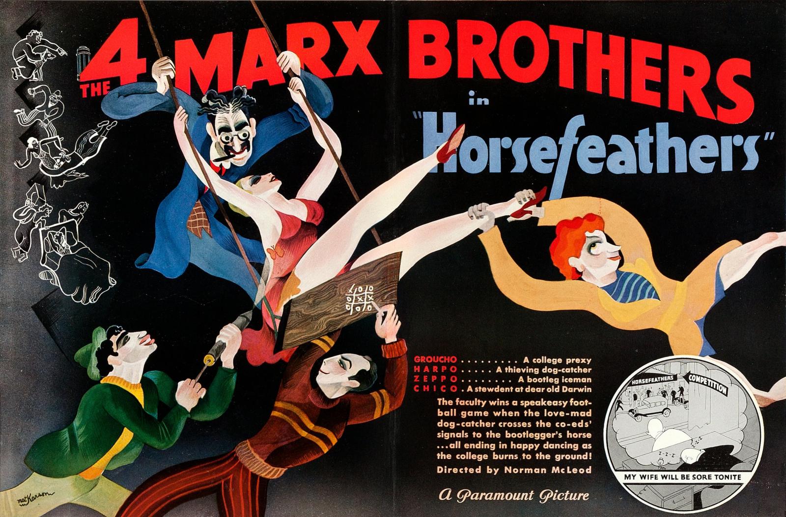 Alternative Plot: The Marx Brothers take on higher education and football in this riotous comedy. The newly minted president of Huxley University, Quincy Adams Wagstaff (Groucho Marx), is getting pressure from his son Frank (Zeppo Marx) to improve the football squad at the school. Frank thinks his father should recruit two professional ball players so Huxley can finally defeat their gridiron rival, Darwin. But when Wagstaff hires the wrong guys, suddenly a pair of bootleggers are wreaking havoc as undergrads.