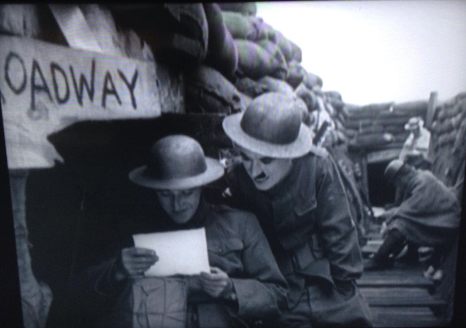 Plot: Charlie is in boot camp in the "awkward squad." Once in France he gets no letters from home. He finally gets a package containing limburger cheese which requires a gas mask and which he throws over into the German trench. He goes "over the top" and captures thirteen Germans ("I surrounded them"), then volunteers to wander through the German lines disguised as a tree trunk. With the help of a French girl he captures the Kaiser and the Crown Prince and is given a statue and victory parade in New York and then ... fellow soldiers wake him from his dream