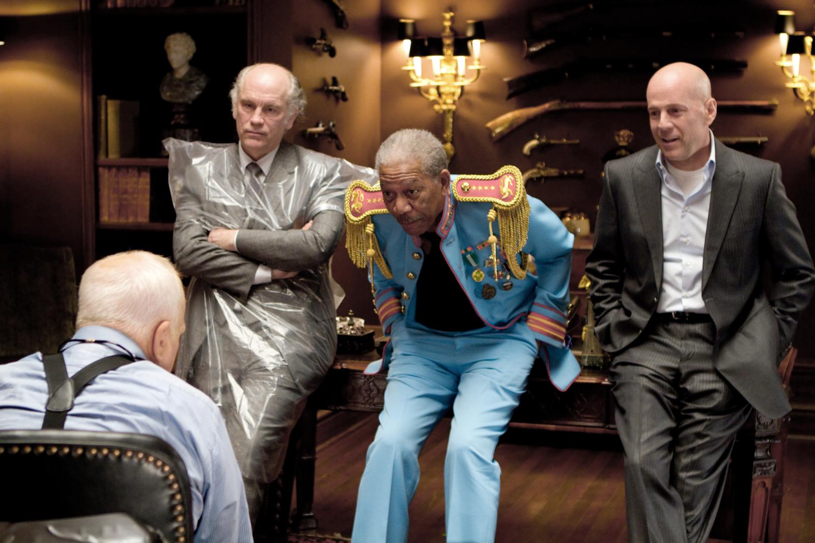 Plot: Former C.I.A. Agent Frank Moses (Bruce Willis) adjusts himself to retirement and even decorates his house for Christmas. He keeps on tearing up his checks as an excuse to keep on conversing with Sarah Ross (Mary-Louise Parker), a Pension Department employee. Then one day, his residence is attacked by heavily-armed, masked assailants. He escapes, but his house is destroyed. He meets with Sarah, abducts her, and convinces her that she in danger. He seeks the assistance of the Russians, and breaks-in to the C.I.A. headquarters and finds his file is tagged as "R.E.D." (Retired Extremely Dangerous). He contacts his former associates: Joe (Morgan Freeman), Marvin (John Malkovich), and Victoria (Helen Mirren), who join him with a plan that will pit them against security forces, especially when he announces their agenda is to kill Vice President Robert Stanton (Julian McMahon). But then things get complicated after Sarah is apprehended and held for interrogation.