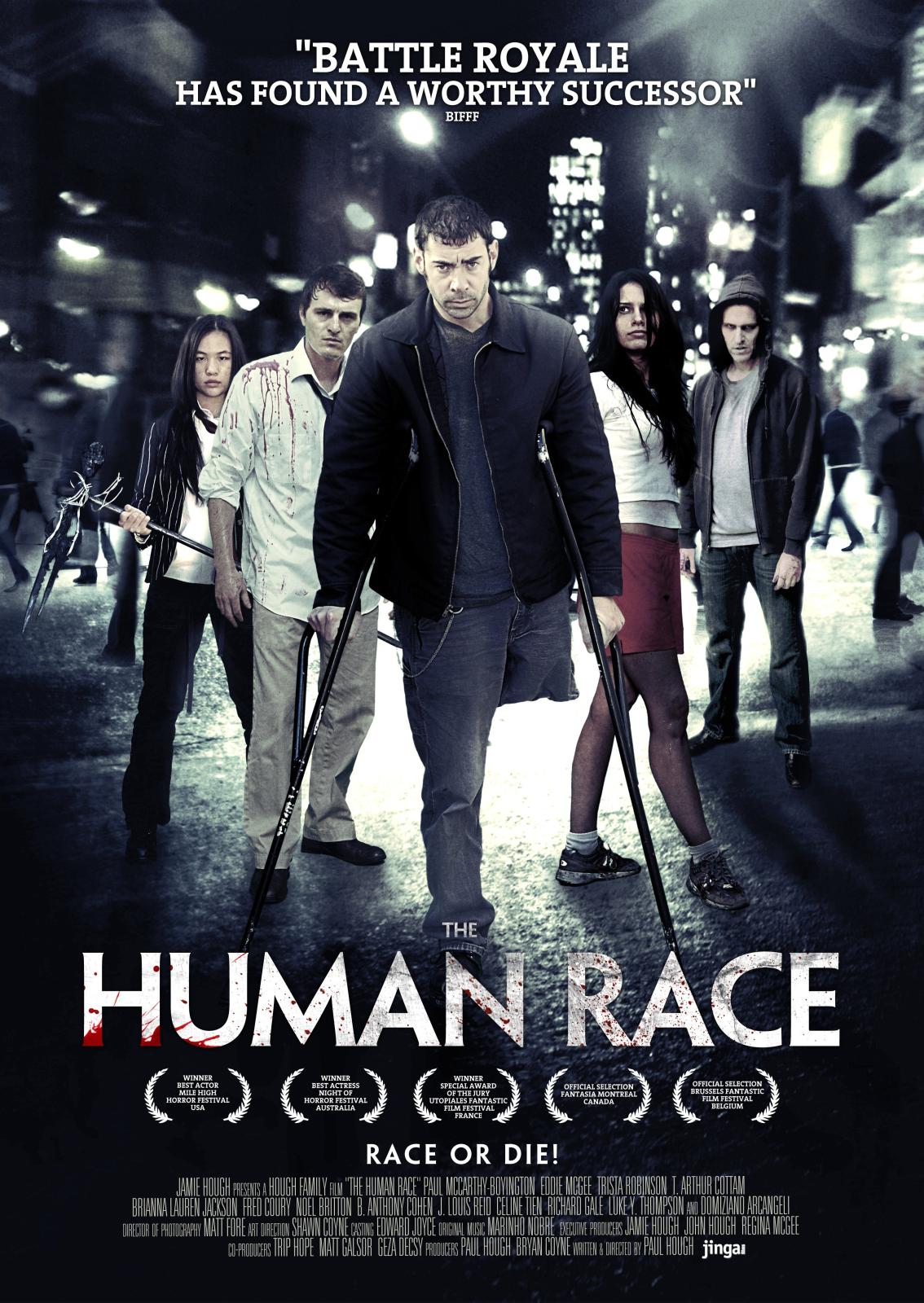 Plot: In THE HUMAN RACE a group of 80 people are ripped out of their daily lives and all re-appear in an undisclosed location. These people are from all walks of life: young and old, athletic and disabled, white-collared and homeless. The rules to a race boom in their heads, in their own voice and language, laying out what will become a horrific race of terror: 'If you are lapped twice, you die. If you step off the path, you die. If you touch the grass, you will die. Race... or die.'